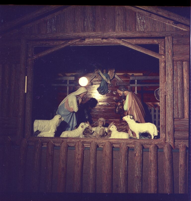 Creche in a wooden stable, with Mary, Joseph, and the Baby Jesus and some sheep, c. 1954. Vivian Maier, photographer. CHM, ICH-180071