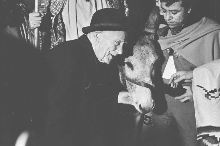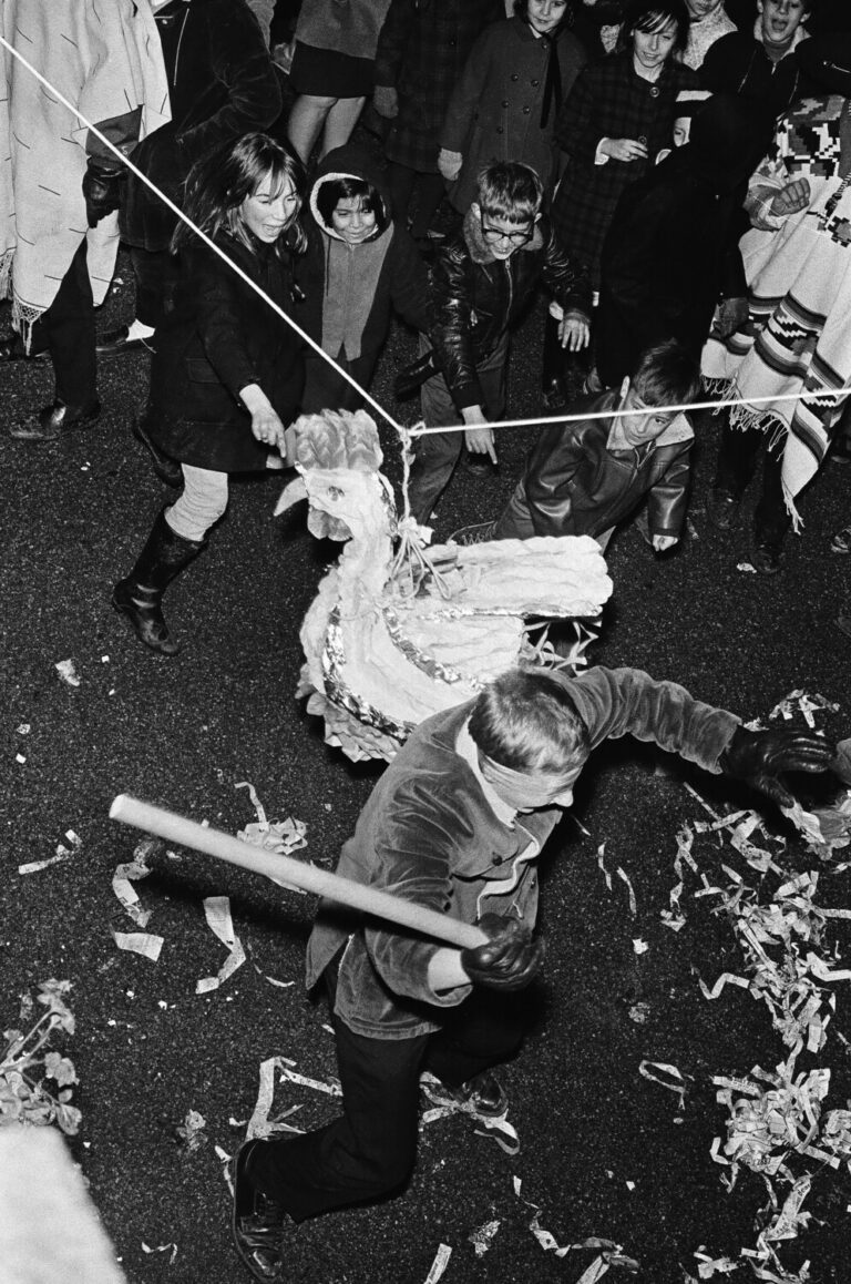 Through the 1960s, the Posadas grew in popularity and public awareness, with John Cardinal Cody, then Archbishop of Chicago, even joining the proceedings in 1968. This series of photographs taken for the Chicago Sun-Times capture the Posadas’ vibrant spirit during the 1960s. That year’s procession began and ended at Café Azteca, led by a burro named “Estrelita” and community members dressed as Mary, Joseph, and the Three Wise Men. It ended like other Posadas, with a breaking of piñatas (this time shaped like birds, not stars) filled with candy and toys and sharing ponche (a hot, spiced fruit punch) and tamales.