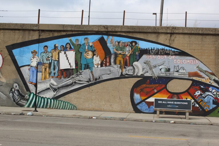 This photograph of “Fallen Dictator,” from Marcos Raya’s (b. 1948) mural Prevent World War III (1980) is currently on view in Aquí en Chicago. The banner depicted in the mural reads “MORENA” (Sheinbaum’s political party) and previously depicted a red and black portrait of Cuban revolutionary Che Guevara, remnants of which can still be seen in the outline behind the current banner. Photograph courtesy of Mario Hernandez, 2024