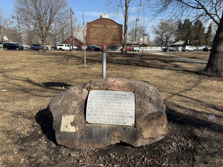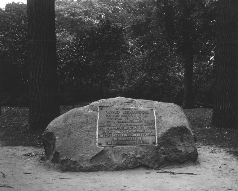 Chicago’s connection to the American Revolution achieved physical permanence with the dedication of a granite boulder on the western edge of Lincoln Park in December 1903. A plaque set within the stone identified the ground below as the final resting place of David Kennison, whose body had been left behind when so many others had been disinterred in the 1860s as a city cemetery transformed into the public park we have today.