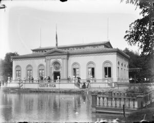 Costa Rica’s Federal-style pavilion by James G. Hill opened as part of “Central American Day at the Fair” alongside Guatemala. It exhibited woods, minerals, animals, medicinal plants, and other products including coffee.