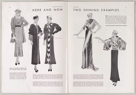 The spring 1933 issue of Fashions of the Hour highlighted American-designed ensembles (left) and the latest Parisian trends (right), including sleek draped dresses and accordion pleating. CHM, ICHi-076919
