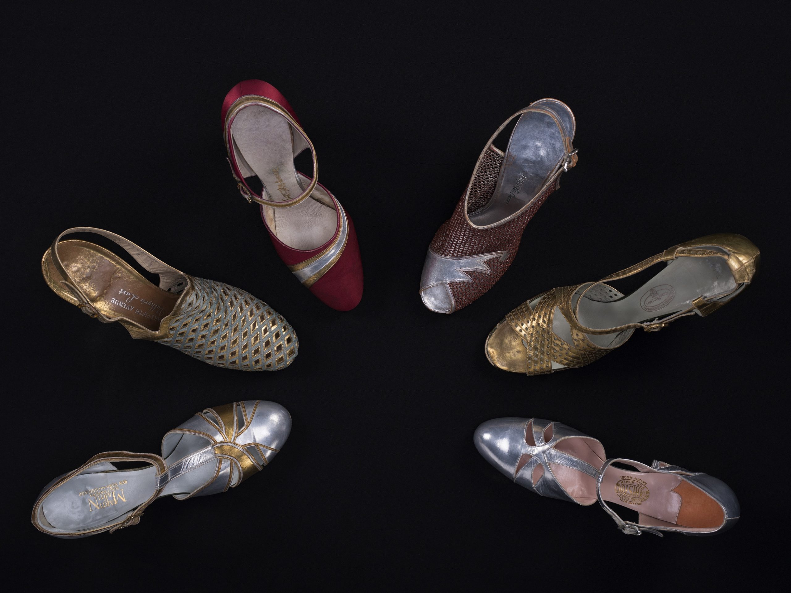 View of various metallic women’s pumps c. 1930.