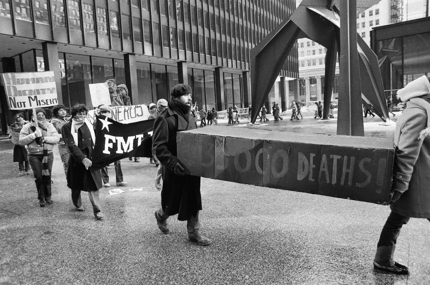 A group of people gather in the Federal Building plaza to protest US aid to El Salvador’s military government during the Salvadoran Civil War, Chicago, February 7, 1982. ST-30002672-0027, Chicago Sun-Times collection, CHM; photograph by Bob Black